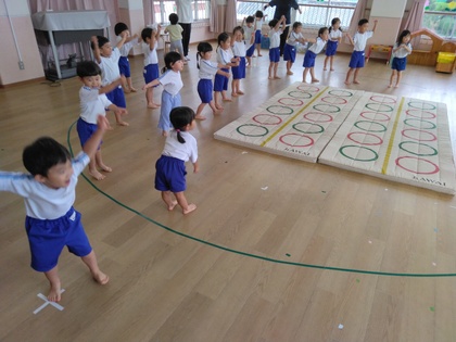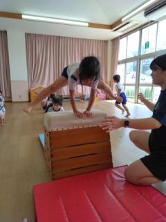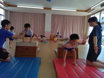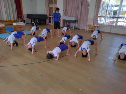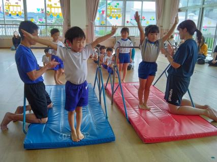 跳び箱や鉄棒など、日頃から取り組んでいる運動あそびを、保護者の方に見てもらいました。