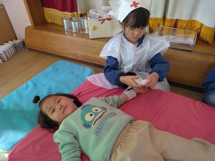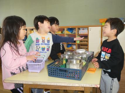 お店屋さんごっこで、イメージを膨らませながらやりとりを楽しんでいます。
