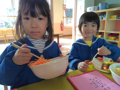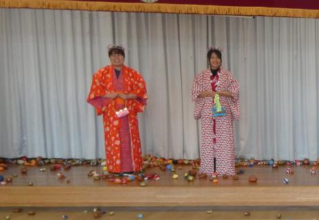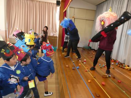“まめまき”の歌をうたって、心のおにも退治したよ。 福の神も登場しました。