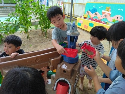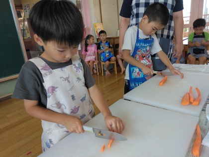 4歳児は野菜の皮むき、5歳児は包丁を使って野菜を切りました。