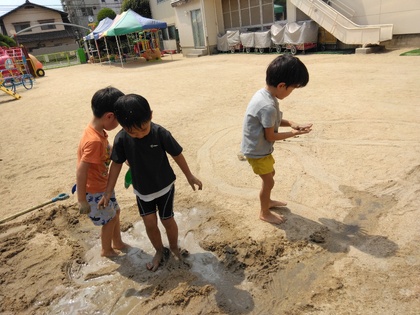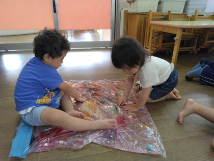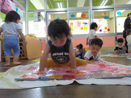 混色を楽しんだり、絵の具の感触を楽しんだりしています。