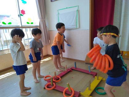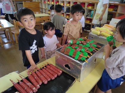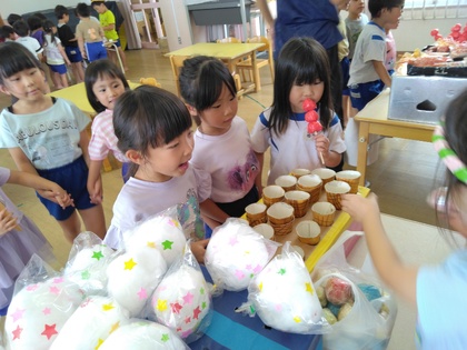 ゲームコーナーや食べ物コーナーなど、5歳児を中心に作ったコーナーで遊び、異年齢の交流が深まりました。