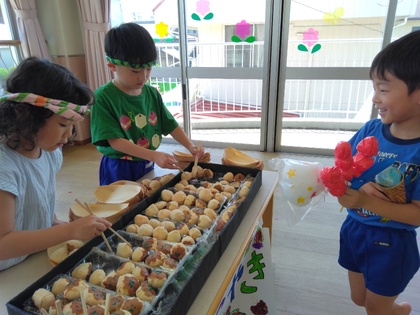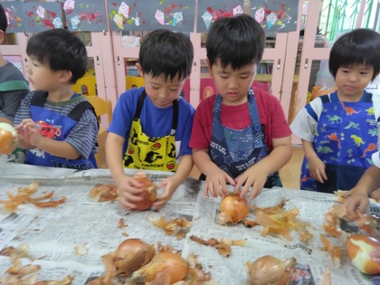3~5歳児で収穫した玉ねぎを使って、玉ねぎパーティーをしました。みんなで協力して作った玉ねぎカナッペはとっても美味しかったよ。