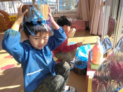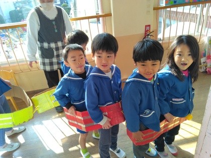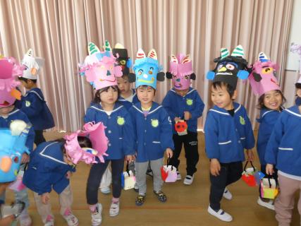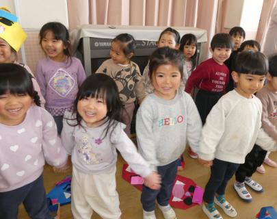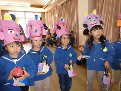“まめまき”の歌をうたって、心のおにも退治したよ。 福の神も登場しました。